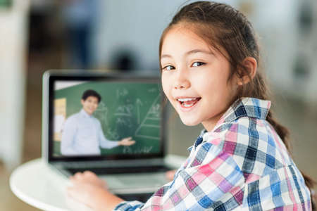 Little asian schoolgirl online learning with laptop at home. Education and distance learning for kids. Homeschooling during quarantine.