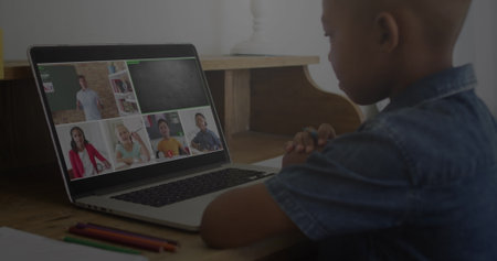 African american boy using laptop for video call, with diverse elementary school pupils on screen. communication technology and online education, digital composite image.
