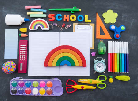 Stationery chalk board. Back to school. Open notepad on top of office supplies. Children stationery for school.