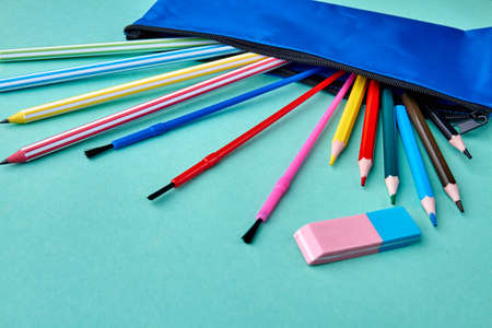 Set of colored pencils scattered on color background. Case with pencils and eraser on turquoise background.