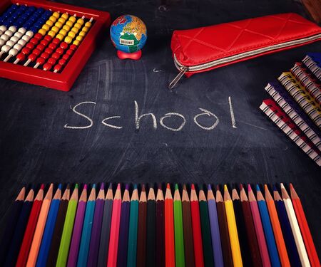 Back to school. Various school supplies on a dark background. The concept of starting a new school year