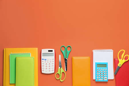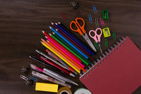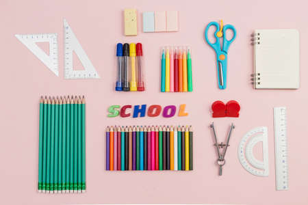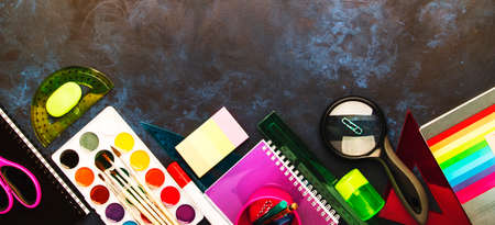 Various stationery for the school on a multi-colored background. Back to school and education concept