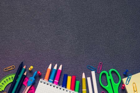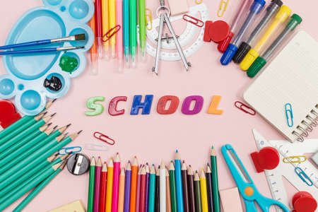School supplies and stationery.Back to school concept. Frame with various colored stationery. copy space.Teaching children primary school.stationery for the study of mathematics and the alphabet