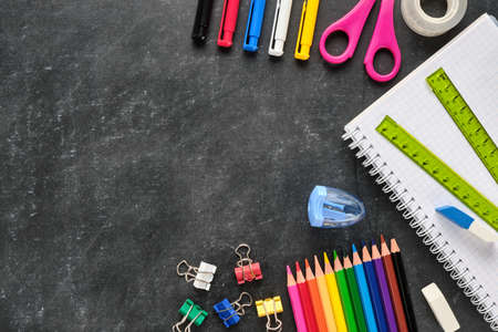 Stationery chalk board. Back to school. Bright kids office supplies. Flat lay