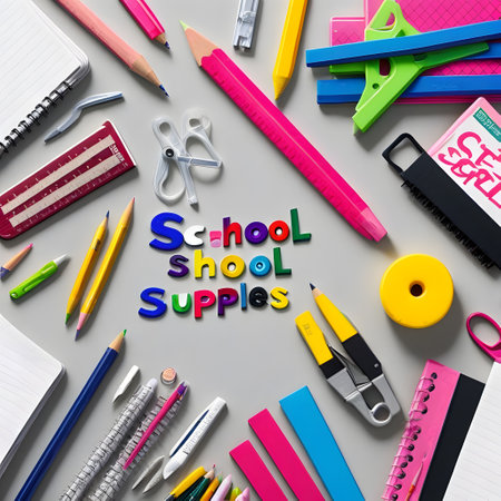 A collection of school stationery items including markers, scissors, calculator, pencils, and paper clips, arranged neatly on a pastel background.