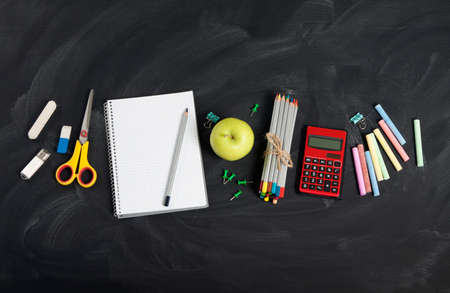 School supplies such as ruler, notebook, pens, pencils, scissors and other on chalkboard
