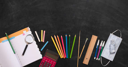 school equipment on black classroom desk, symbol of education and virus spread prevention in the time of covid19 with copy space, above view