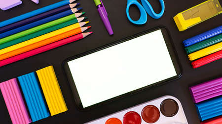 School flatley on the topic back to school, school supplies on a chalk board from above with a copy space on the phone screen