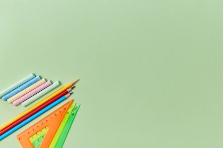 School supplies background. New schoolyear. Welcome back to school. Colored crayons, color pencils and rulers on green.