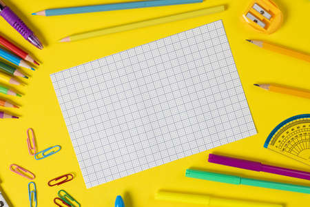 Back to school design template on white background with space for text. School background with bright stationery. Design template for school announcements and advertisements.
