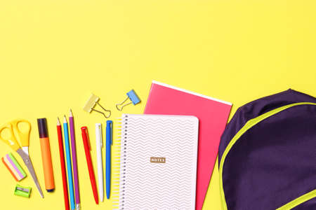 Imagine of various office supplies and plastic utensils, notebook, crayons on yellow background. Education, learning and creativity.
