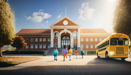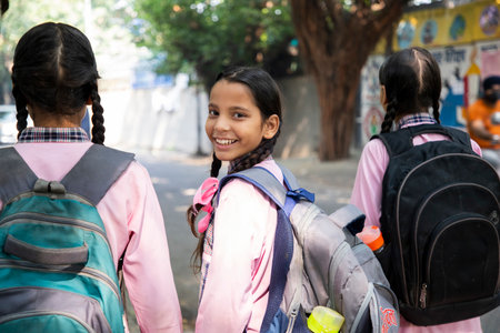 Multiracial little girls kids children multiethnic African American schoolgirls friends walking outdoors education female classmates students pupils studying campus academy class back to school city