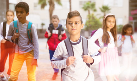 Happy little kid boy with satchel, walking. Schoolkid on the way to middle or high school. Excited child outdoors on school yard. Back to school.