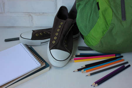 School supplies on a white brick wall background. Backpack, sneakers, colored pencils, albums, notebooks on a white table. Back to school concept.