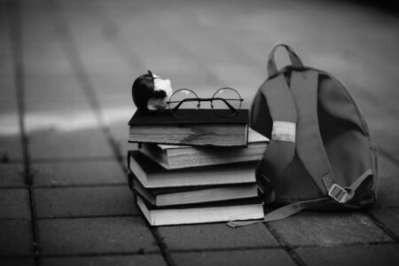 Backpack prepared with study supplies and mask for the return to school. Covid-19 concept.