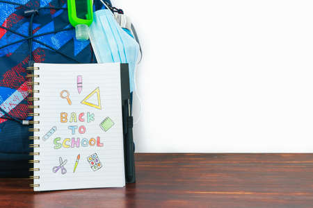Notebook with back to school drawing. Blue backpack with mask and disinfectant gel. Copy space