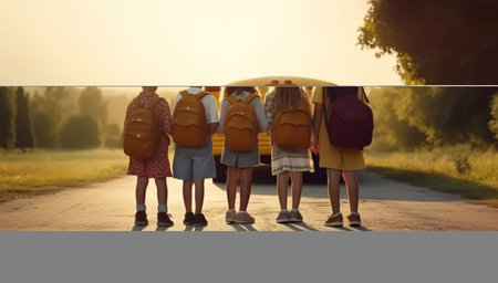 Cheerful teen classmates chatting at classic school bus. Three school children standing at yellow academic shuttle waiting boarding. Cheerful teenagers friends communicating outdoors before studies.