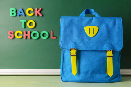 Stylish backpack on table against blackboard with text BACK TO SCHOOL