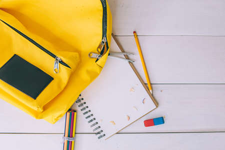 Back to school concept. Yellow backpack with notepad and stationery on a wooden background