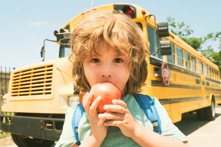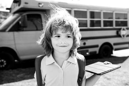 Pupil kid with tablet near school bus. Social distance during quarantine, on-line education concept, homeschool outside.