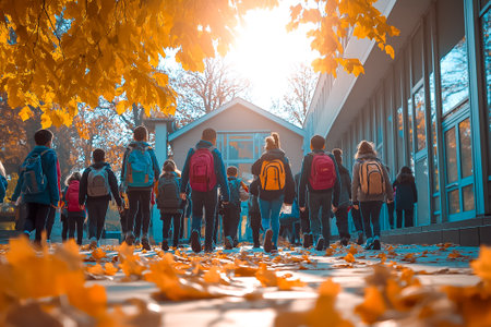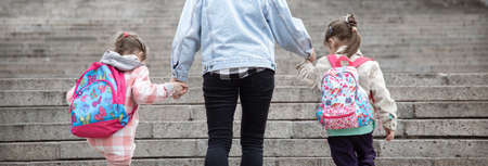 Parent and pupil of primary school go hand in hand. Mom of two girls with a backpack behind the back. Beginning of lessons. First day of fall.