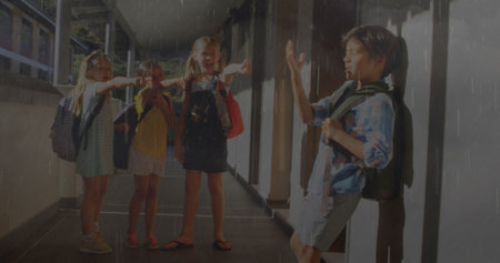 Composite image of rainfall and thunderstorms against group of students bullying a boy at school. school and education concept