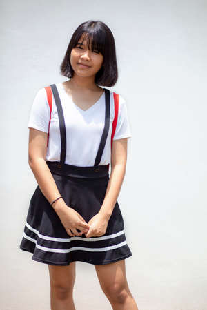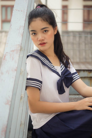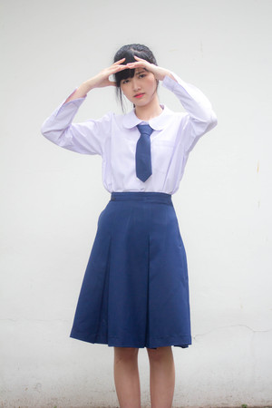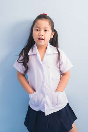 portrait student young girl in uniform school and backpack on green background, Asian girl, Teenager.