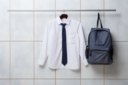 Modern school uniform and backpack hanging on color wall. high quality photo