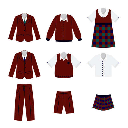 School uniform for boys and girls vector illustrations set. Clothes for male and female students, suit, shirt, blazer, dress, skirt isolated on white background. School, education, fashion concept