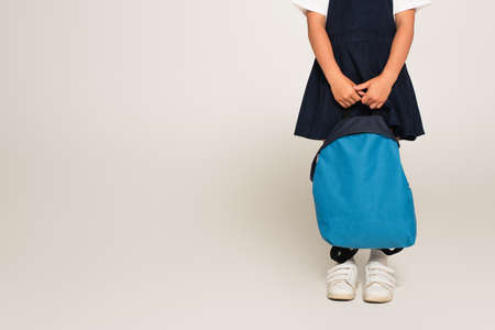 cropped view of schoolgirl standing with blue backpack on gray