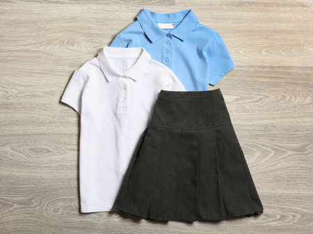 Stylish school uniform on wooden background