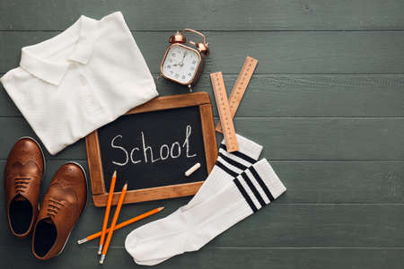 Chalkboard with text SCHOOL, uniform, alarm clock and stationery on dark wooden background