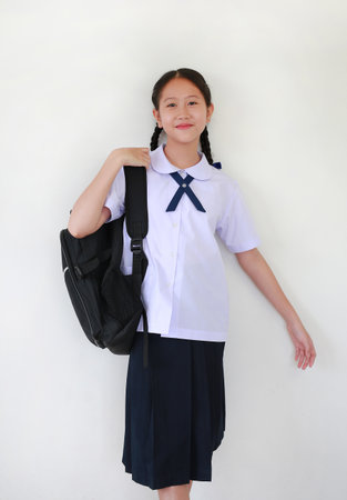 Smiling Asian student girl in school uniform carrying backpack bag against white studio background. Schoolgirl back to school concept.