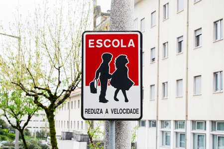 A School Crossing Sign Positioned in Front of Children Walking Towards School