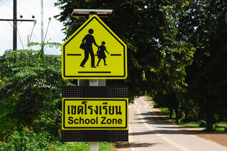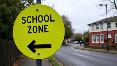 A vibrant school zone sign stands tall on a quiet residential street, guiding pedestrians and emphasizing safety in the sunny suburb. Trees line the road, enhancing the serene atmosphere.