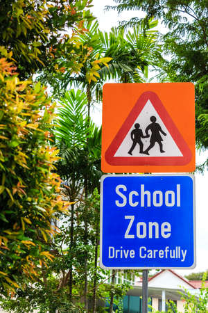 School zone yellow road sign, pedestrian crossing. Children safety on street, New York City. Transport and education symbol, USA . Traffic roadsign in Queens, Long Island, Hunters point.