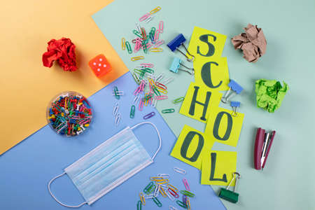 School supplies and stationery.Back to school concept. Frame with various colored stationery. copy space.Teaching children primary school.stationery for the study of mathematics and the alphabet