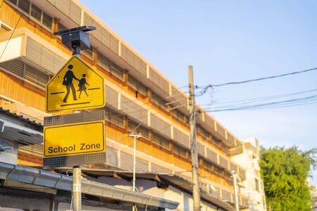 Warning signs indicate the location of the school. The background is the school building, back to school concept