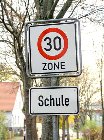 A 30km/h speed limit traffic road sign for a school area in Germany
