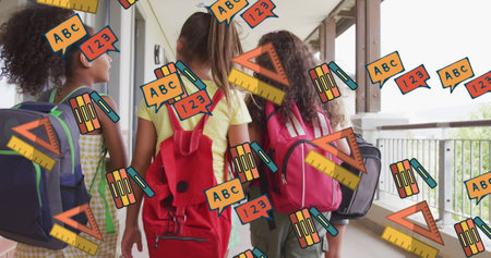 Image of school items icons over diverse schoolchildren. Global education, learning and digital interface concept digitally generated image.