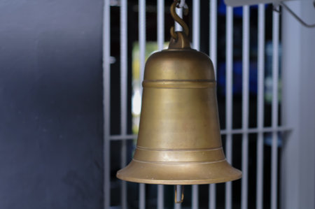 Closeup of a golden bell hanging on a metal wall with a blurry background
