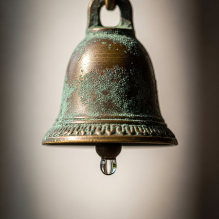 The image captures an antique bell with a tarnished surface, highlighting its intricate design and historic significance. The soft lighting enhances the textures and age of the bell.