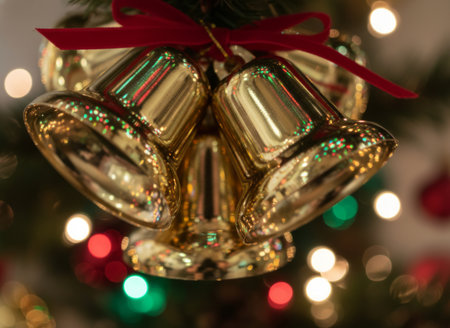 Close-up of a golden bell with a luxurious red bow, warm holiday lighting highlighting its shiny surface and festive background.