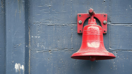 A vibrant red bell mounted on a weathered wooden wall, showcasing vintage charm and rustic character. Perfect for capturing an inviting atmosphere.