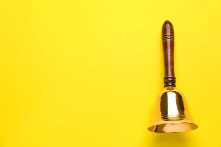 Golden school bell with wooden handle on yellow background. Space for text