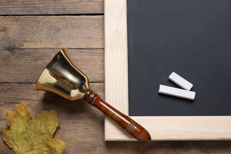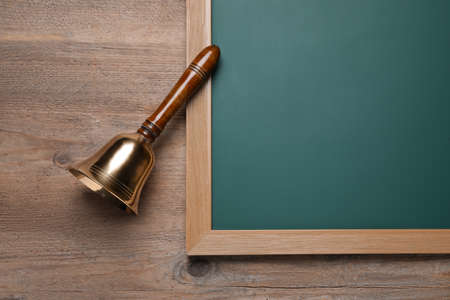 Golden bell and green chalkboard on wooden background, flat lay. School days