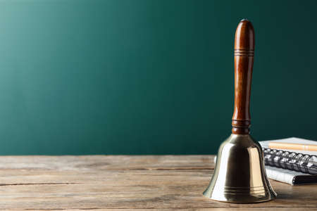 Golden bell and notebooks on wooden table near green chalkboard, space for text. School days