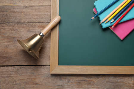 Golden bell, green chalkboard and stationery on wooden background, flat lay. School days