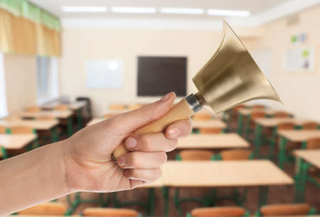 Woman with school bell in empty classroom, closeup