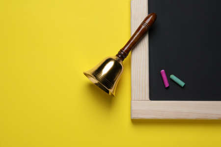Golden bell, blackboard and pieces of chalk on yellow background, flat lay. School days